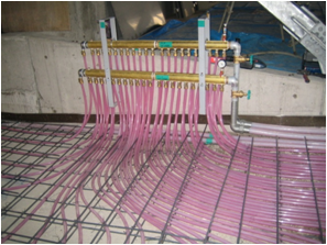 温水ヘッダー(ピンク色は不凍液)